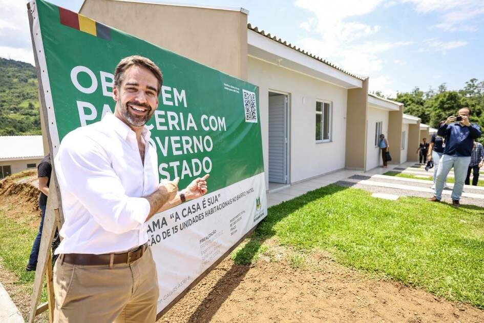 O governo do Estado entregou, nesta quinta-feira (27), 15 moradias definitivas em Feliz, no Vale do Caí, em cerimônia presidida pelo governador Eduardo Leite. A solenidade, realizada na Rua Lauro Bruno Rott, contou com a participação do secretário de Habitação e Regularização Fundiária, Carlos Gomes, além de autoridades municipais e representantes da comunidade local. O investimento estadual foi de R$ 1,2 milhão, somado à contrapartida municipal de R$ 726 mil.