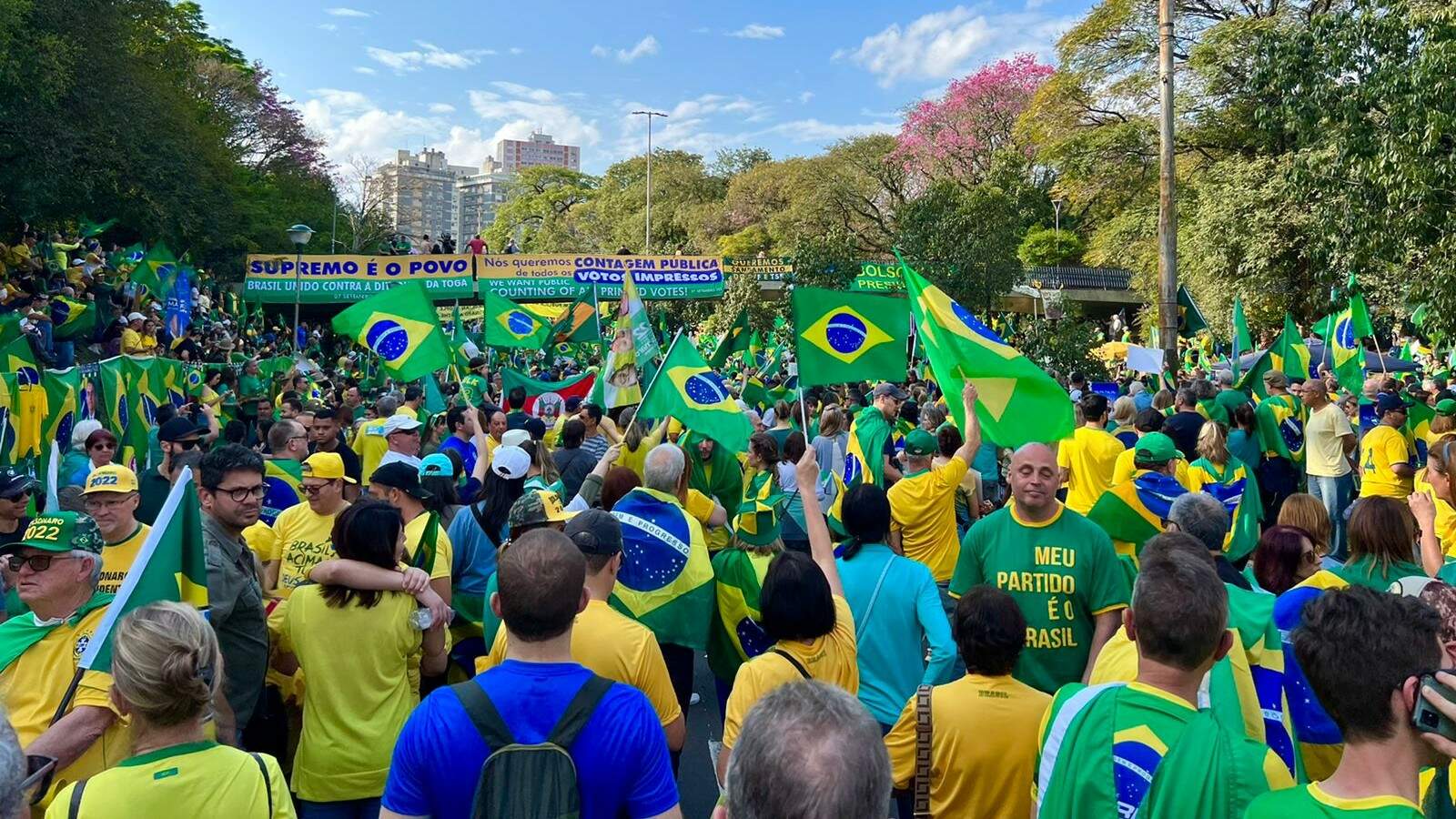 A maioria das pessoas está reunida, justamente, nas faixas da Avenida Goethe, onde estão localizados carros de som que ditam o ritmo da manifestação. Apoiadores do presidente pedem voto na eleição deste ano, falam contra os partidos de esquerda e o Supremo Tribunal Federal (STF).