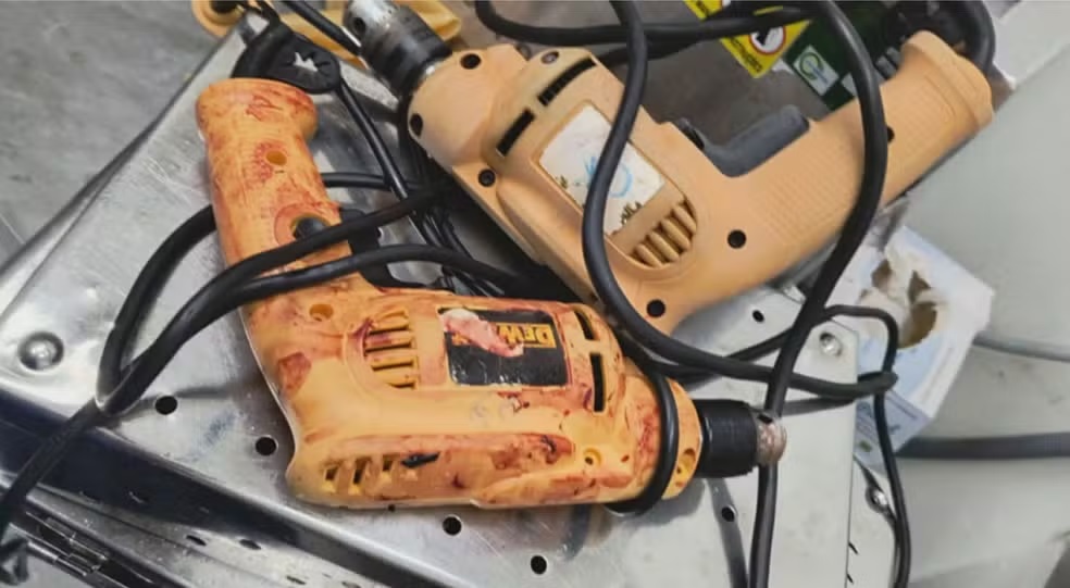 Nas imagens, é possível ver as furadeiras, que são proibidas pela Anvisa desde 2008, usadas pelos médicos com marcas de sangue e até com fios desencapados