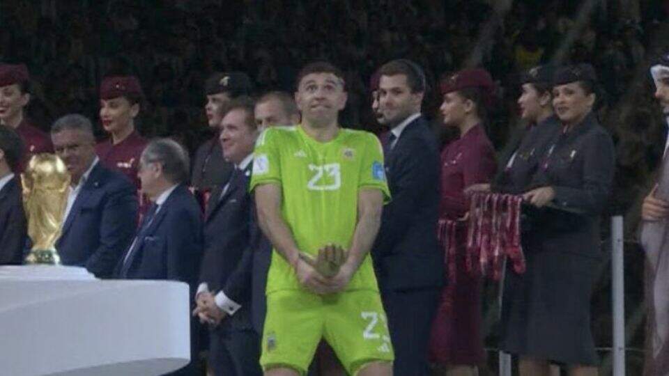 Ao receber o troféu de melhor goleiro da Copa do Mundo do Catar, o argentino Emiliano Martínez segurou a “Luva de Ouro” em frente às suas partes íntimas, simulando um pênis. O gesto viralizou na internet.