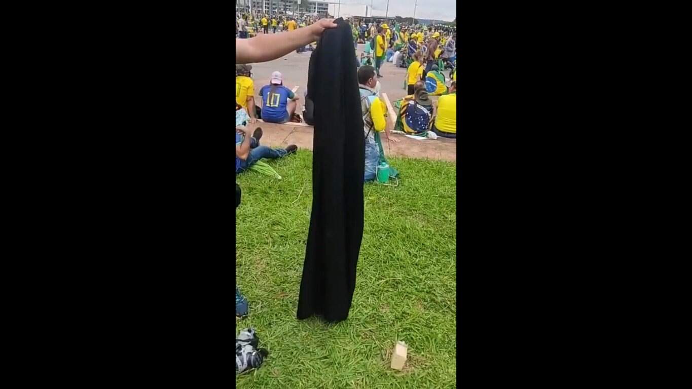 Os radicais que invadiram o Supremo Tribunal Federal (STF) neste domingo (8), roubaram até uma toga de ministro da Corte. Em vídeo que circula nas redes sociais, um extremista, que está em um gramado na Esplanada, exibe a peça de roupa preta.