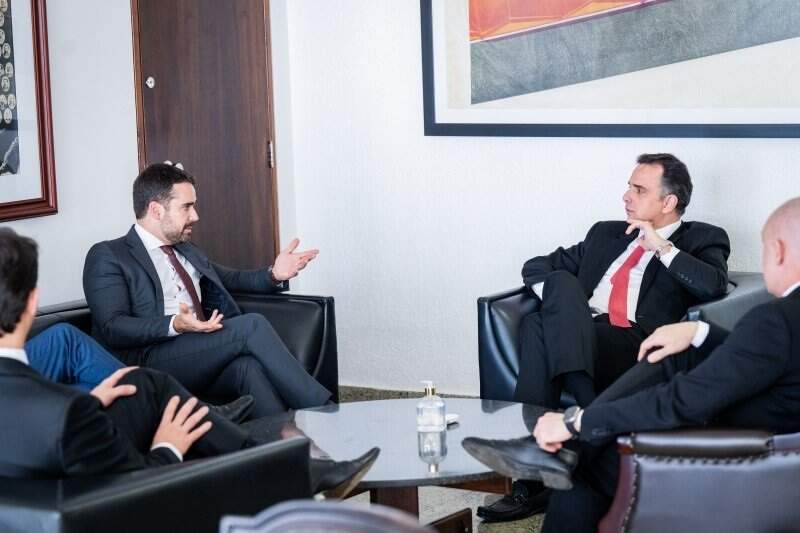 No Senado, Leite e o chefe da Casa Civil, Artur Lemos, se reuniram com o presidente da Casa, senador Rodrigo Pacheco, para tratar da tramitação da Reforma Tributária, aprovada na Câmara dos Deputados.