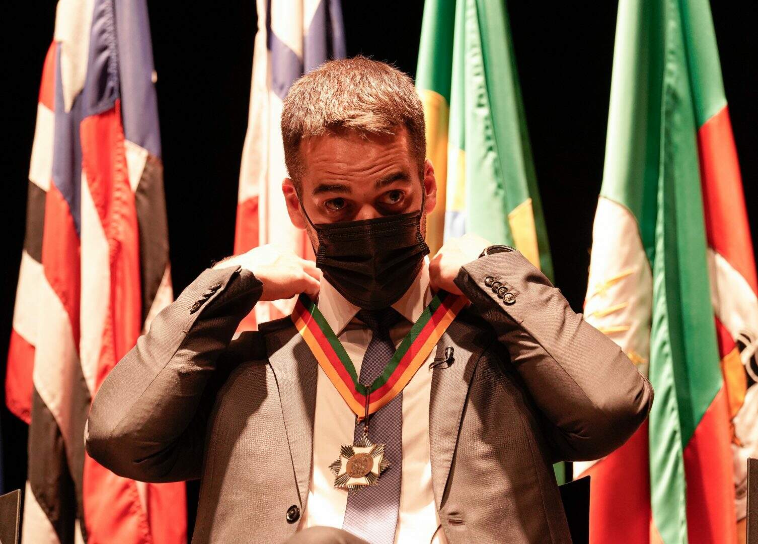 O governador Eduardo Leite recebeu, nesta quarta-feira (23), a Medalha do Mérito Farroupilha, mais alta honraria concedida pela Assembleia Legislativa gaúcha. A outorga da homenagem foi proposta pelo deputado estadual Frederico Antunes, líder do governo no parlamento.