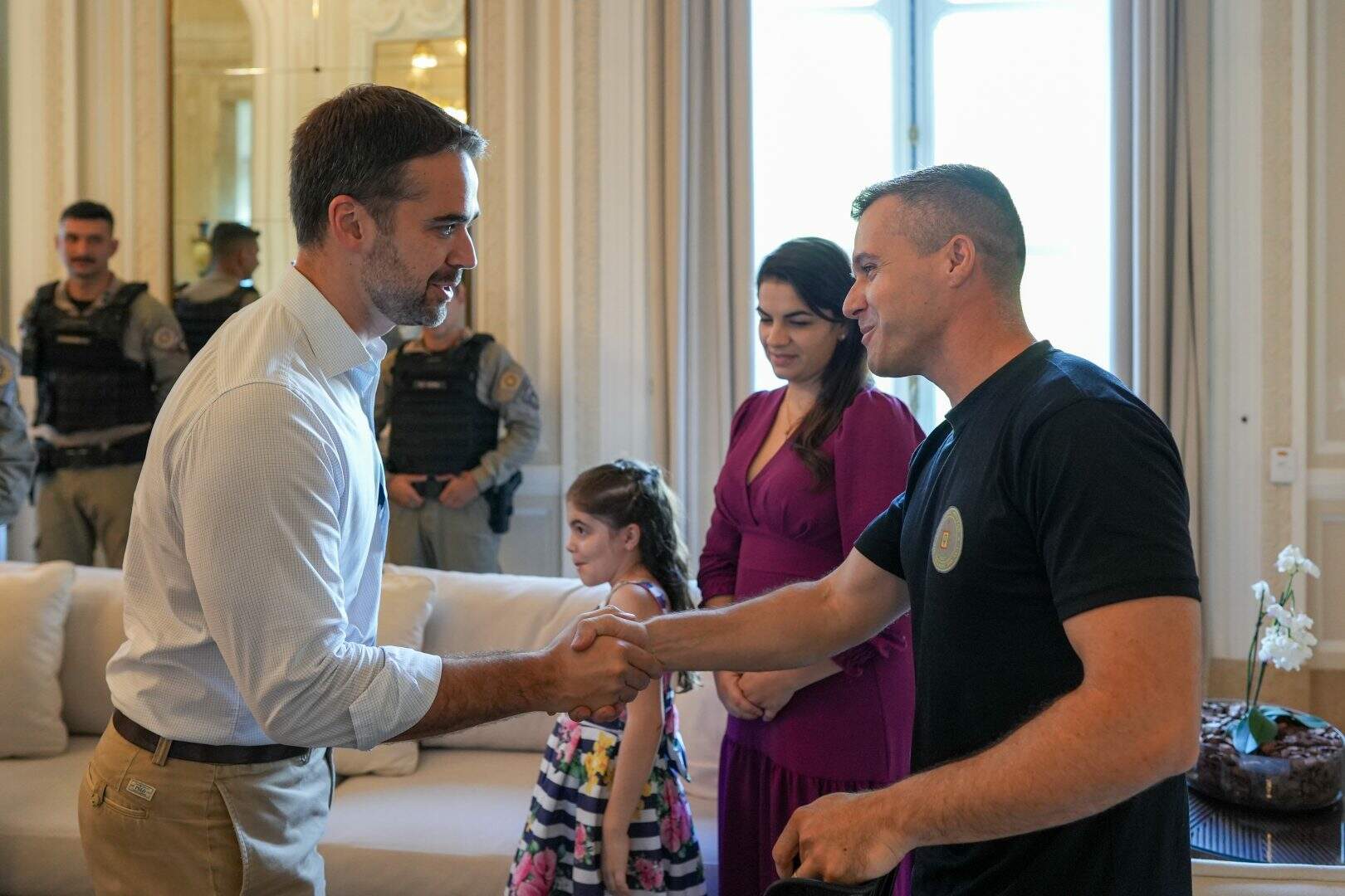 O governador Eduardo Leite recebeu nessa segunda-feira (1º) no Palácio Piratini, o soldado da Brigada Militar (BM) Jaison Soares Casani, 31 anos e que sobreviveu a tentativa de homicídio ao abordar um criminoso em Gravataí (Região Metropolitana). Acompanhado da esposa, da filha de 7 anos e de colegas que atuaram na ocorrência, ele relembrou o episódio ocorrido na noite de 23 de março.