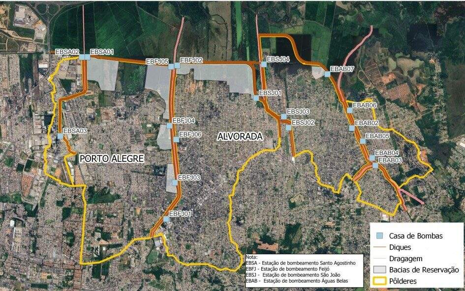diques de proteção principal no Gravataí e nos Arroios Santo Agostinho, Feijó, São João, Águas Belas, abrangendo em torno de 14 bairros, sendo dez em Alvorada e quatro em Porto Alegre. Ao todo, será protegida uma área de aproximadamente 20 km²;