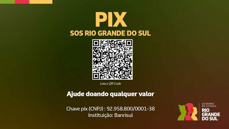 Diante da situação de calamidade pública enfrentada no Rio Grande do Sul, o governo gaúcho reativou o canal de doações para a conta SOS Rio Grande do Sul. Foi restabelecida a chave Pix (CNPJ: 92.958.800/0001-38), a mesma utilizada no ano passado, vinculada à conta bancária aberta pelo Banrisul. As contribuições em dinheiro podem ser feitas por pessoas físicas e jurídicas que tenham condições de ajudar as vítimas das enchentes.