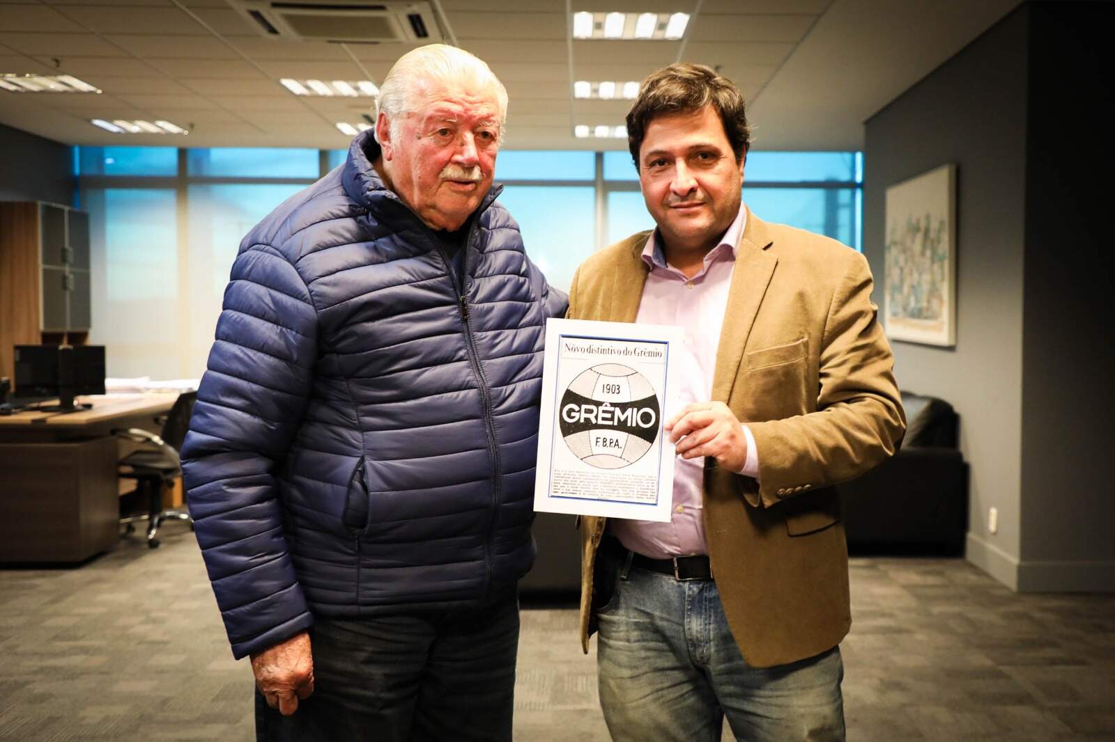 O Grêmio celebra nesta terça-feira (15), o aniversário de 60 anos do escudo atual do Clube. Para marcar a data, o presidente Alberto Guerra recebeu na Arena o ilustrador e fotógrafo Helio Devinar, responsável por desenhar a primeira versão publicada do então novo distintivo do Tricolor.