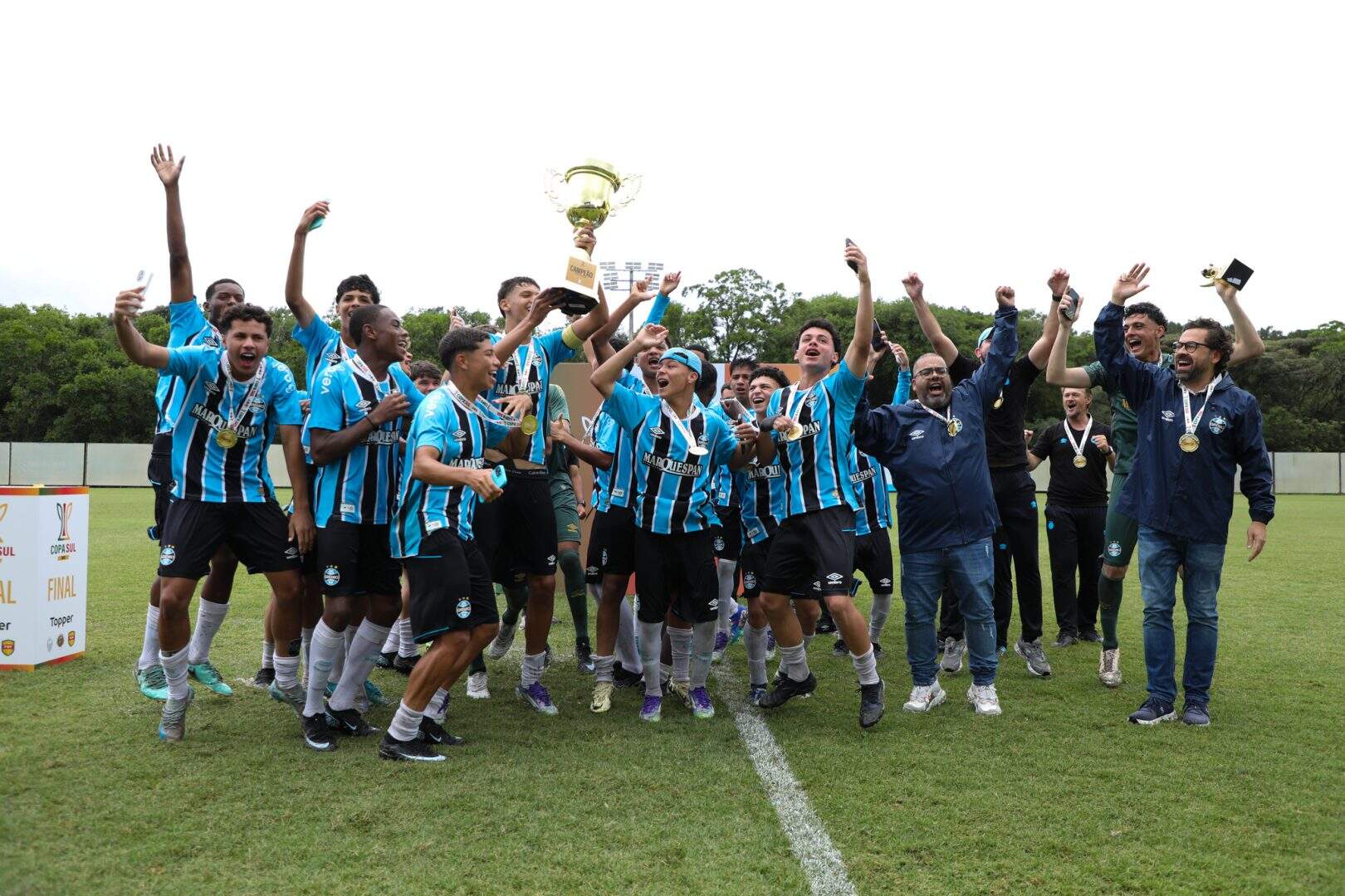O Grêmio celebrou na manhã desta quarta-feira (10) a conquista inédita da Copa Sul Sub-15, ao vencer o Athletico Paranaense por 2 a 0 no Estádio Airton Ferreira da Silva, em Eldorado do Sul. Com gols de João Gabriel e do capitão Mateus Sergio, o Tricolor reverteu a derrota por 1 a 0 sofrida no jogo de ida e garantiu o troféu com o placar agregado de 2 a 1.