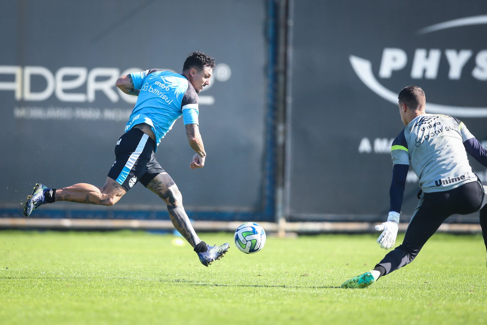 Durante o aquecimento comandado pelo preparador físico Reverson Pimentel, o grupo de jogadores pode participar de uma ação de velocidade e agilidade em grupos, com corridas em curto médio espaço. Depois, passaram para um treino tático em campo reduzido com comando do técnico Renato Portaluppi.