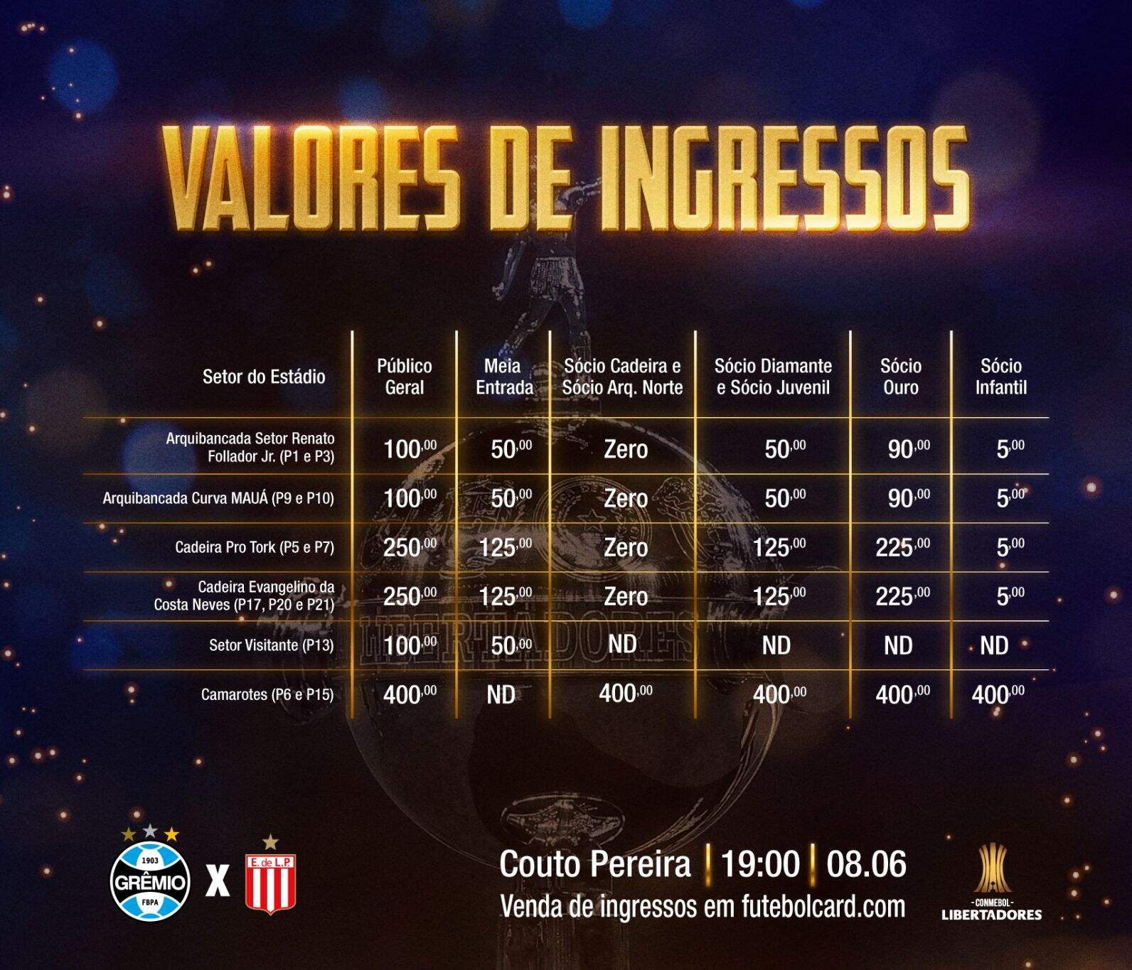 Até o momento, o Grêmio já garantiu a venda de 7,5 mil ingressos para a partida decisiva contra o Estudiantes-ARG pela Libertadores. Por conta das enchentes no Rio Grande do Sul, a Arena do Grêmio, em Porto Alegre, não deverá receber nenhum jogo enquanto estiver em processo de limpeza e recuperação. Portanto, o duelo do próximo sábado (8), será no estádio Couto Pereira, em Curitiba, às 19h (de Brasília).
