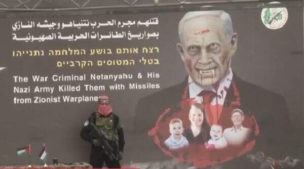 Na entrega dos corpos, o Hamas estampou uma imagem do primeiro-ministro israelense, Benjamin Netanyahu, com dentes de vampiro e sangue saindo da sua boca.
