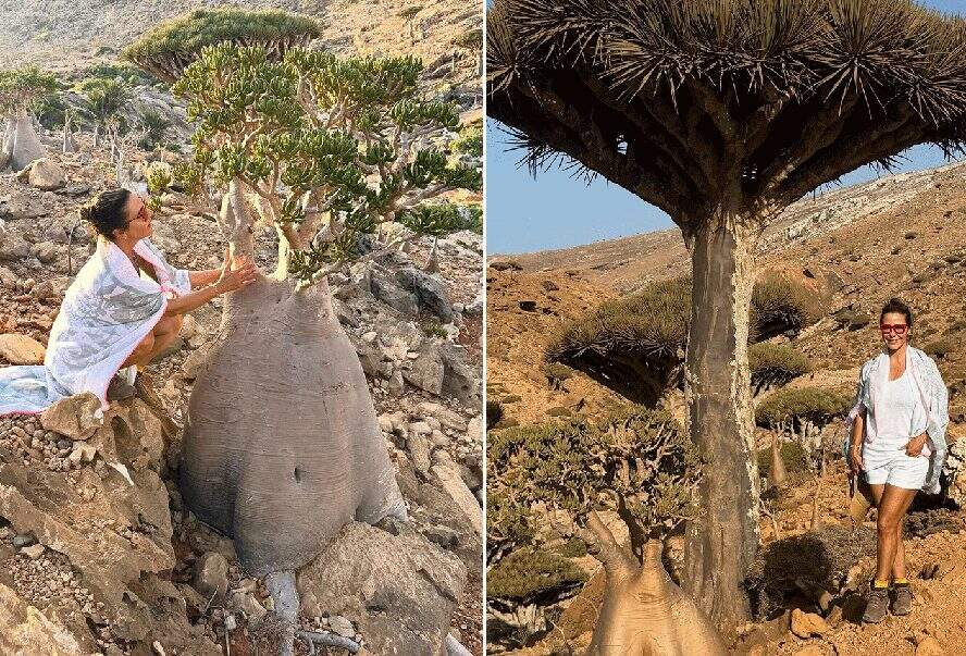 “Essas árvores são conhecidas como bottle trees ou ‘árvores-garrafa’. O nome científico delas é Adenium obesum socotranum. Elas têm troncos dourados e arredondados e perdem todas as folhas durante a seca. De repente aparece uma flor do deserto linda em cima. Rosa. Elas armazenam água em seus caules para sobreviver aos longos períodos de seca, uma adaptação perfeita ao clima árido e aos ventos do Índico”, contou.