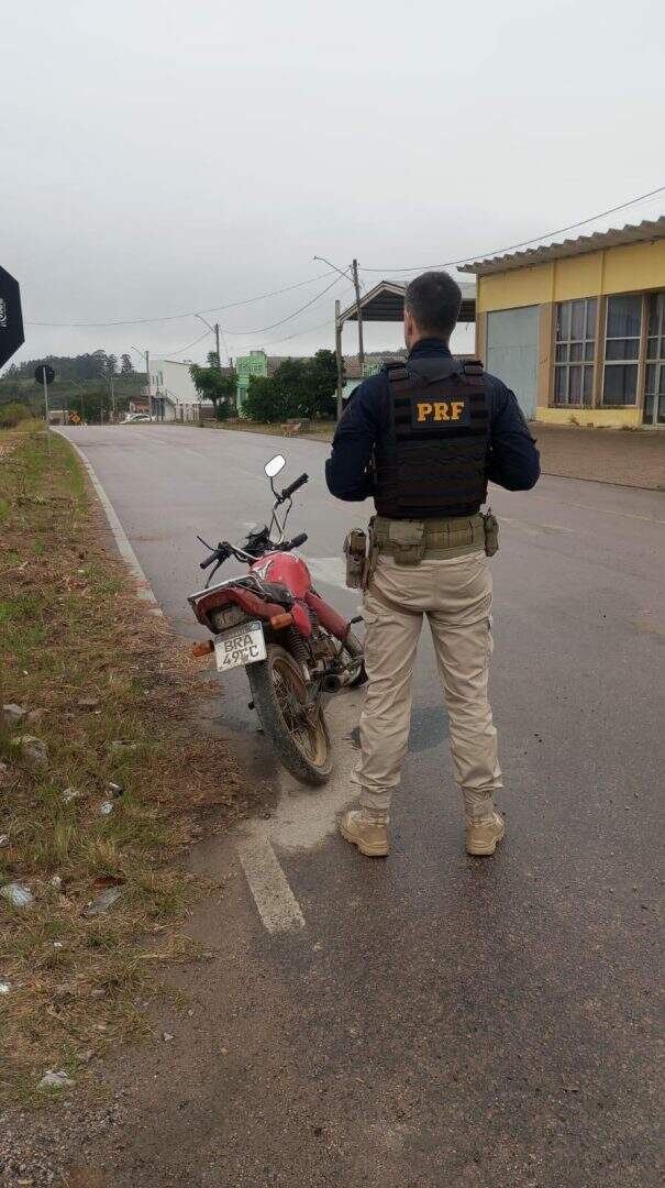 Durante fiscalização na rodovia, os policiais rodoviários federais perceberam que uma moto transitava sem lanterna e ostentando uma placa fora do padrão. Eles deram ordem de parada ao condutor e, ao aprofundarem a fiscalização, os policiais constataram que a motocicleta estava na condição de “baixada”, ou seja, já não pode mais circular em vias públicas.