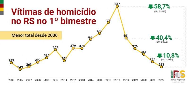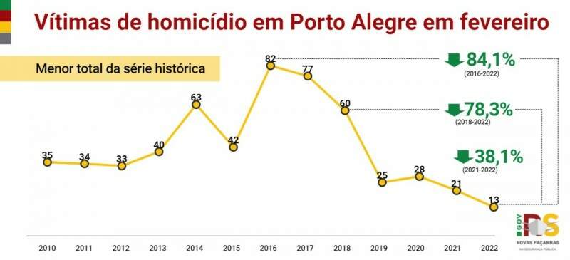 No Estado como um todo, o acumulado de homicídios entre janeiro e fevereiro caiu de 295 no ano passado para 263, retração de 10,8% e o menor total desde 2006. Na comparação com 2018, último ano antes da implantação do RS Seguro, quando os dois meses somaram 441 vítimas de assassinato, a queda chega a 40,4%. Contra o pico de 637 homicídios no primeiro bimestre de 2017, a diminuição é de mais que a metade: 58,7%.