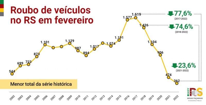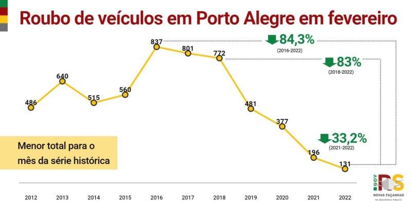 Porto Alegre, que integra o grupo, teve diminuição de 196 roubos de veículo em fevereiro de 2021 para 131 no segundo mês deste ano, baixa de 33,2%. Na comparação dos 1º bimestres, a queda foi de 26,1%, passando de 394 casos para 291. Em ambos os casos, os menores totais das séries.