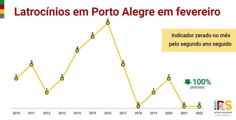 Em Porto Alegre, 2022 ainda não teve registros de roubos com morte, o que deixa o indicador zerado tanto no recorte de fevereiro (o que ocorre pelo segundo ano seguido) quanto no acumulado do primeiro bimestre.