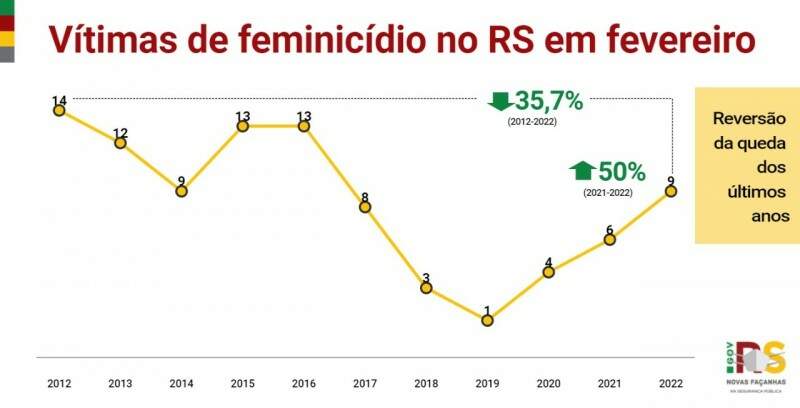 Já os feminicídios voltaram a subir em fevereiro. Subiu de seis, no ano passado, para nove vítimas (50%) neste ano o número de mulheres assassinadas em razão do gênero no Rio Grande do Sul. Com isso, o acumulado do bimestre também fica em alta, com dois casos a mais, de 17 para 19 (11,8%) – leia mais abaixo.