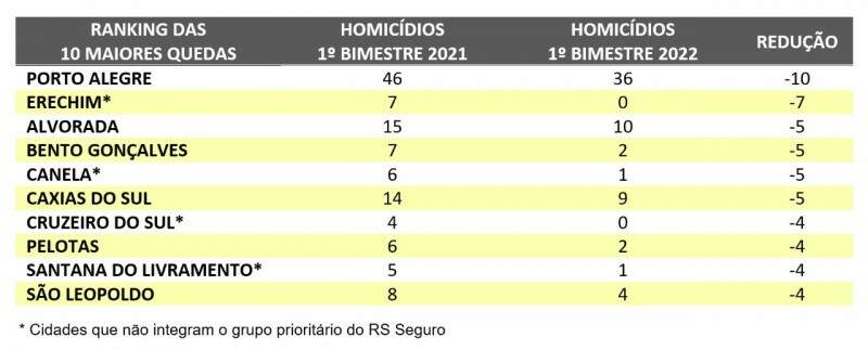 Do conjunto de cidades monitoradas, 14 terminaram fevereiro com queda ou estabilidade no número de vítimas de homicídio – Cachoeirinha, na Região Metropolitana, também zerou o índice. A queda verificada no mês também se reflete no acumulado do bimestre, em que o ranking das 10 maiores reduções tem seis posições ocupadas por cidades do grupo priorizado pelo programa.