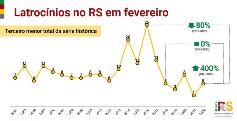 Com a alta no recorte mensal, o acumulado dos dois primeiros meses do ano também subiu, de sete casos em 2021 para nove em 2022 (28,6%). No bimestre, contudo, os números atuais de latrocínios, à exceção do recorde alcançado no ano passado, seguem em patamar abaixo do registrado em qualquer um dos anos da série histórica, iniciada em 2002.