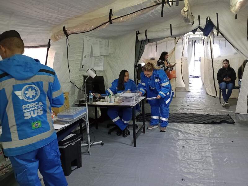 “Nós damos suporte à rede e, com isso, reduzimos a sobrecarga do sistema público, que está impactado com a situação no Rio Grande do Sul, inclusive com unidades de saúde fechadas”, explica o enfermeiro Adriano de Araújo da Silva, que atua no Hospital de Campanha de Novo Hamburgo, junto à Unidade de Pronto Atendimento (UPA) Centro. O Hospital de Campanha de Novo Hamburgo conta com seis médicos, cinco enfermeiros e oito técnicos de enfermagem de diversos estados brasileiros.