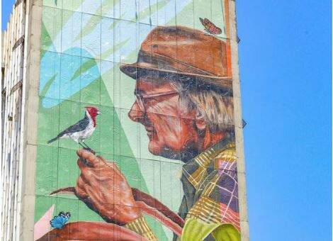 A imagem do ambientalista gaúcho José Lutzenberger foi estampada na parede lateral do prédio do Ipê Saúde e Ipê Prev, em Porto Alegre. O mural foi inaugurado nesta sexta-feira (25) e faz parte das atividades da Virada Sustentável 2022. O painel colorido lembra a natureza, em tons verde, azul e terrosos, com 50 metros de altura, e mostra Lutzenberger em primeiro plano, interagindo com um cardeal, pássaro tradicional do Sul.