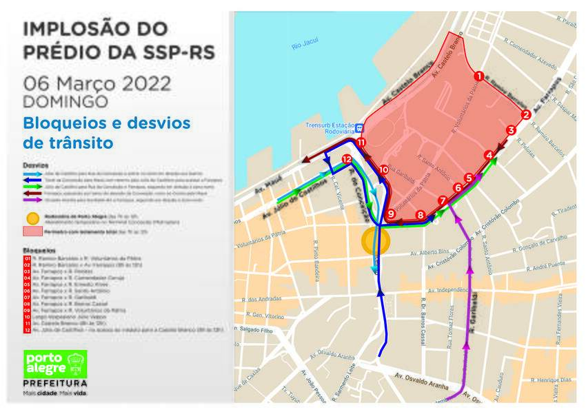 Na manhã de domingo (6), a partir das 7h haverá bloqueio total em um raio de 300 metros a partir do prédio da antiga sede da SSP. Neste período, a Estação Rodoviária estará fechada e os ônibus vão operar no Terminal Conceição, da Metroplan, entre as avenidas Alberto Bins e Farrapos, embaixo do viaduto. Também serão fechadas as estações Mercado, Rodoviária e São Pedro, do Trensurb. A EPTC vai disponibilizar ônibus para o deslocamento dos passageiros da estação Farrapos até a estação Mercado.