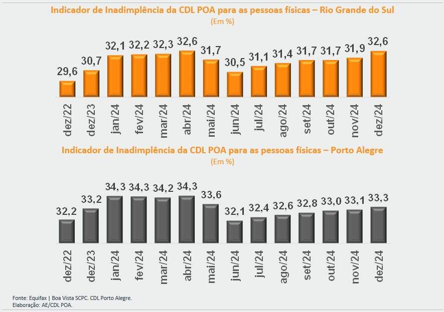 A CDL (Câmara de Dirigentes Lojistas) de Porto Alegre divulgou os resultados dos Indicadores de Inadimplência de Pessoas Físicas e Jurídicas referentes a dezembro de 2024. Entre as pessoas físicas, o índice praticamente retornou ao nível pré-enchente no RS, registrando 32,57%, enquanto em Porto Alegre atingiu 33,33%.