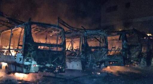 Quatro lotações ficaram destruídas, na noite de segunda-feira (17), após um incêndio em uma garagem na Estrada Gedeon Leite, na Zona Sul de Porto Alegre.
