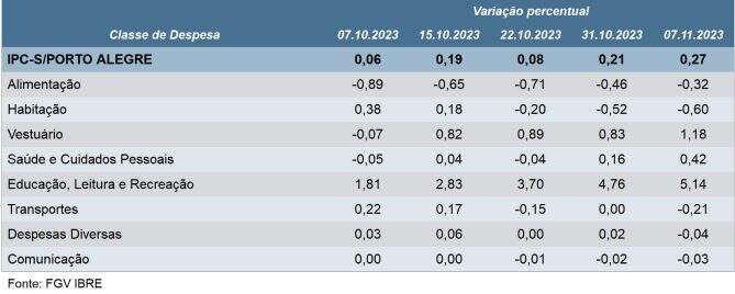 Nesta apuração, quatro das oito classes de despesa componentes do índice apresentaram aceleração em suas taxas de variação, entre as quais se destacam os grupos educação, leitura e recreação, cuja taxa aumentou de 4,76% para 5,14%, e vestuário, que subiu de 0,83% para 1,18%. Já a variação do grupo alimentação passou de -0,46% para -0,32%.