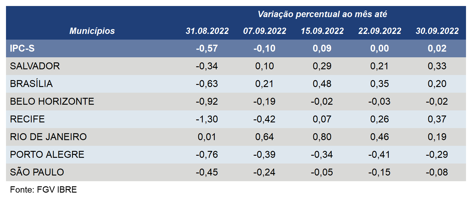 O IPC-S (Índice de Preços ao Consumidor – Semanal) variou -0,29% em Porto Alegre na quarta semana de setembro. Na semana anterior, o índice havia ficado em -0,41%. Com o resultado, a inflação para o consumidor acumula alta de 4,35% nos últimos 12 meses na Capital gaúcha.