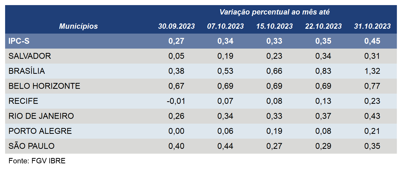 Além de Porto Alegre, o IPC-S subiu em outras cinco das sete capitais pesquisadas pela FGV na última semana de outubro.
