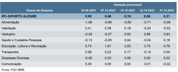 O IPC-S (Índice de Preços ao Consumidor – Semanal) aumentou de 0,08% para 0,21% em Porto Alegre na quarta semana de outubro, de acordo com dados divulgados nesta quarta-feira (1º) pela FGV (Fundação Getulio Vargas).