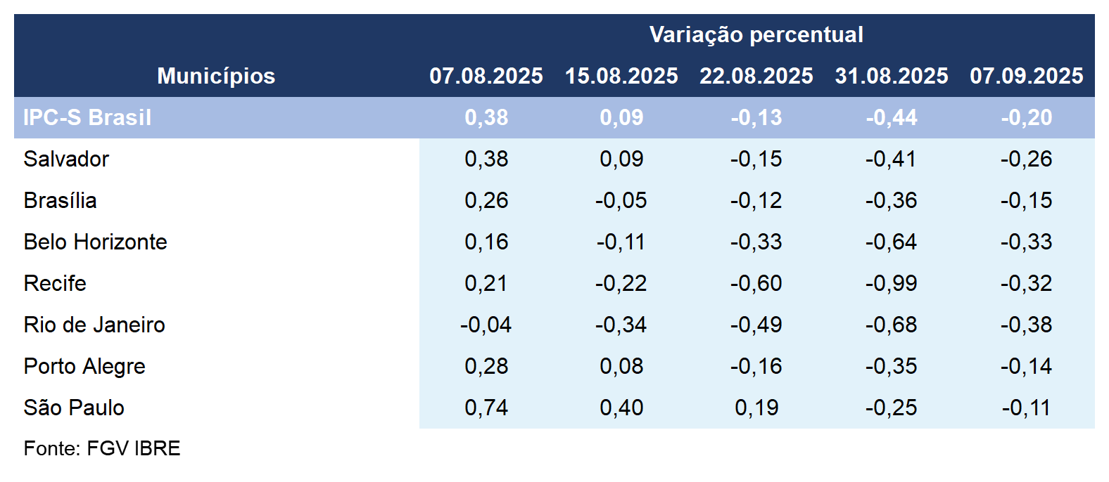 No País, o IPC-S passou de -0,44% para -0,20%. Com esse resultado, o indicador acumula alta de 2,90% nos últimos 12 meses.
