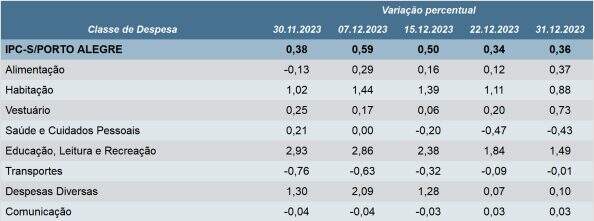 O IPC-S (Índice de Preços ao Consumidor – Semanal) aumentou de 0,34% para 0,36% em Porto Alegre na última semana do ano passado, segundo dados divulgados nesta quarta-feira (3) pela FGV (Fundação Getulio Vargas).