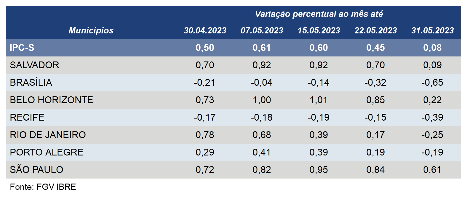 Além de Porto Alegre, o IPC-S caiu nas outras seis capitais pesquisadas pela FGV na quarta semana de maio.