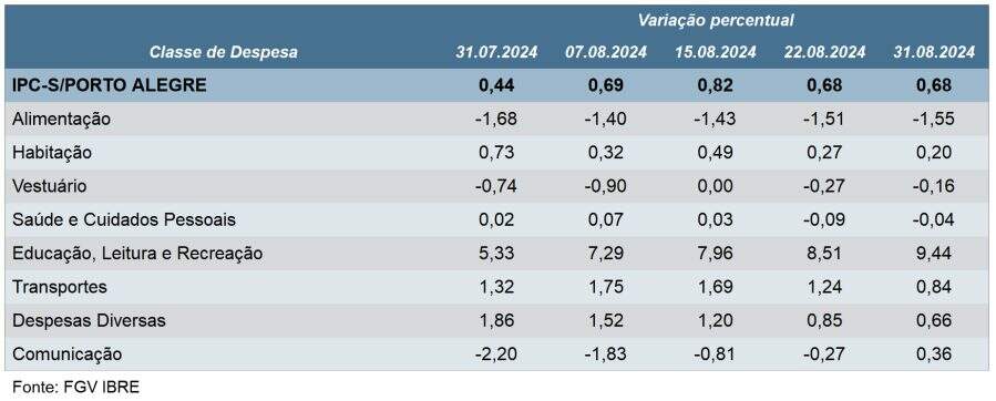 O IPC-S (Índice de Preços ao Consumidor – Semanal) permaneceu em 0,68% em Porto Alegre na quarta semana de agosto, de acordo com dados divulgados nesta terça-feira (3) pela FGV (Fundação Getulio Vargas).
