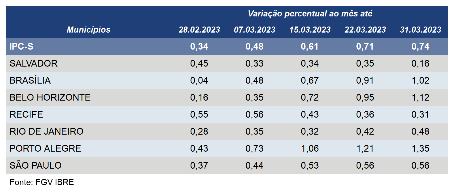 Além de Porto Alegre – onde o IPC-S registrou aumento em todas as apurações no mês passado –, o índice acelerou em outras três das sete capitais pesquisadas pela FGV na quarta semana de março.