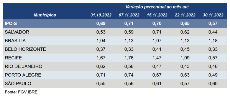 Além de Porto Alegre, o IPC-S desacelerou em outras três das setes capitais pesquisadas pela FGV na última semana de novembro.