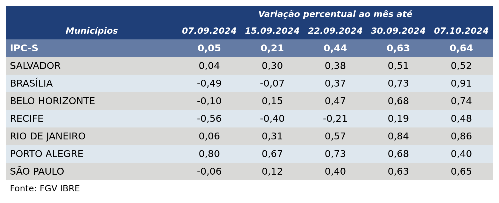 Entre as sete capitais pesquisadas pela FGV na primeira semana de outubro, a inflação para o consumidor caiu apenas em Porto Alegre, registrando alta nas demais cidades.