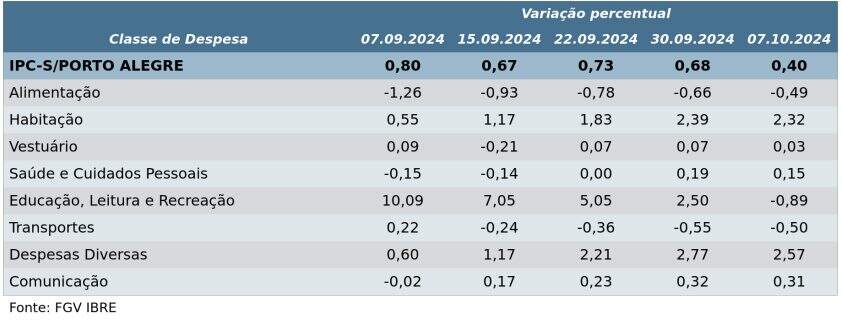 O IPC-S (Índice de Preços ao Consumidor – Semanal) recuou de 0,68% para 0,40% em Porto Alegre na primeira semana deste mês, de acordo com dados divulgados pela FGV (Fundação Getulio Vargas).