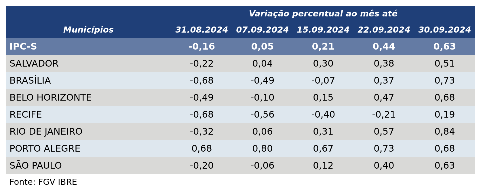 Nas outras seis capitais pesquisadas pela FGV, o IPC-S teve alta na quarta semana de setembro.