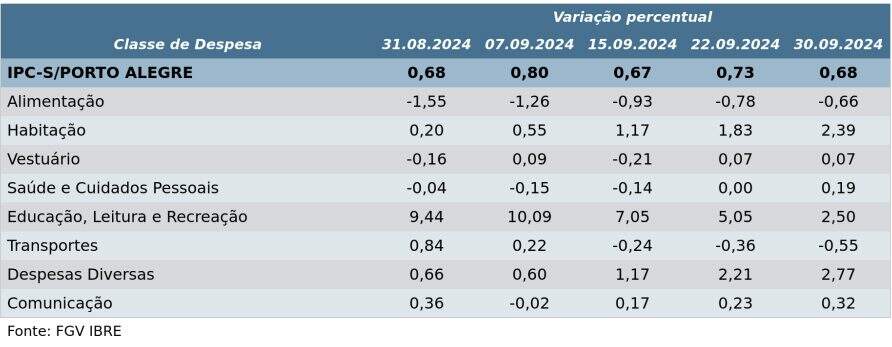 O IPC-S (Índice de Preços ao Consumidor – Semanal) recuou de 0,73% para 0,68% na última semana de setembro em Porto Alegre, de acordo com dados divulgados nesta quarta-feira (2) pela FGV (Fundação Getulio Vargas).