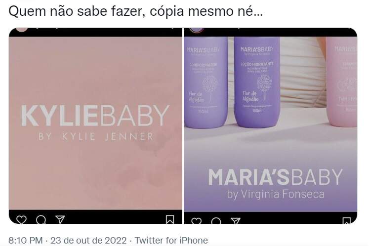 A integrante do clã Kardashian-Jenner é reconhecida por lançar tendências, servindo de inspiração para várias blogueiras brasileiras. Coincidentemente, assim como Kylie, Virgínia lançou os produtos após o nascimento de Maria Alice e Maria Flor. A diferença é que a ‘Kylie Baby‘ foi lançada em setembro do ano passado.