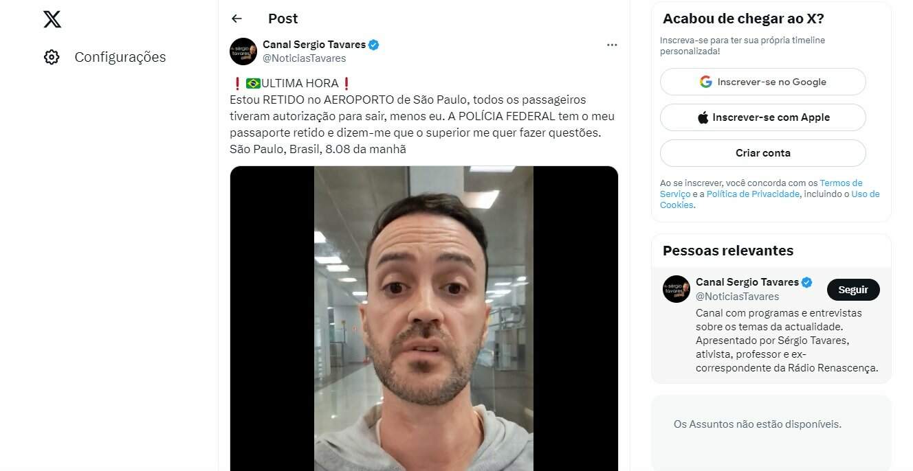 O influenciador português Sérgio Tavares, que recentemente entrevistou o ex-presidente Jair Bolsonaro (PL) em uma live em seu canal no YouTube, postou um vídeo em seu perfil no X (antigo Twitter) em que diz ter sido detido pela Polícia Federal (PF) no Aeroporto de Guarulhos (GRU) ao desembarcar no Brasil, na manhã deste domingo (25).