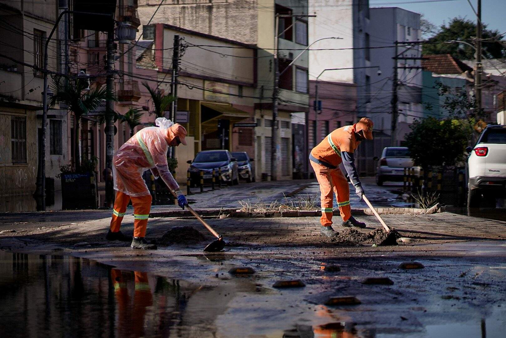 O Departamento Municipal de Limpeza Urbana (DMLU) iniciou nesta quarta-feira (15) os trabalhos de limpeza nas partes secas dos bairros Cidade Baixa e Menino Deus em Porto Alegre.