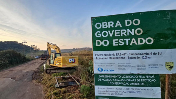 Foi iniciada nessa sexta (7) às obras de pavimentação da ERS-427, no acesso ao cânion de Itaimbezinho, entre Tainhas e Cambará do Sul. A rodovia tem parte do trecho dentro do Parque Nacional Aparados da Serra. Além de ser fundamental para o desenvolvimento do potencial turístico da região, é importante ligação entre o Rio Grande do Sul e Santa Catarina. O valor a ser investido na obra, que tem 17 quilômetros de extensão, é de R$ 36 milhões, e integra o Programa Avançar, do governo do Estado.