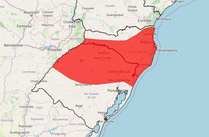 Segundo o Inmet, o alerta vai da região central e norte do Rio Grande do Sul até o norte de Santa Catarina. A tempestade pode atingir regiões de cidades como Caxias do Sul, Passo Fundo e Erechim, em território gaúcho; e Criciúma, Blumenau e Joinville, além da capital catarinense, Florianópolis.