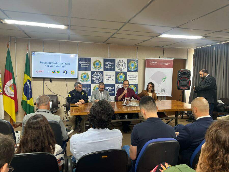 O Ministério do Trabalho e Emprego (MTE), o Ministério Público do Trabalho (MPT) e a Polícia Rodoviária Federal (PRF) apresentaram, em entrevista coletiva realizada na manhã desta segunda-feira (26), na sede da Superintendência Regional do Trabalho e Emprego (SRTE), em Porto Alegre, os resultados da Operação In Vino Veritas, realizada de 21 de janeiro a 23 de fevereiro na Serra Gaúcha. Na coletiva, foram apresentados os números da operação. Ao longo de 30 dias, equipes de fiscalização vistoriaram aproximadamente 300 propriedades na região, para a apuração de eventuais irregularidades trabalhistas no setor vitivinicultor.