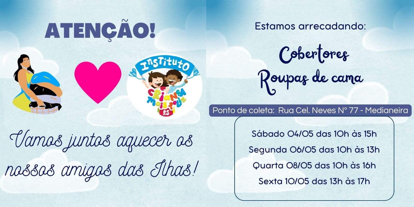 O Instituto Criança Mais Feliz RS está realizando campanha de arrecadação de cobertores, roupas de cama e banho, fraldas e roupinhas de bebê. O ponto de coleta fica na rua Cel. Neves, 77, bairro Medianeira em Porto Alegre.