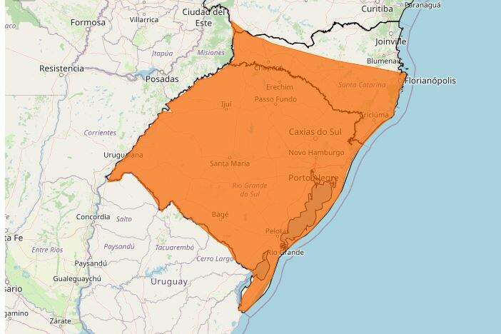 O alerta é válido para as seguintes áreas: Serrana e Oeste Catarinense, Sudoeste Rio-grandense, Vale do Itajaí, Noroeste Rio-grandense, Grande Florianópolis, Centro Ocidental Rio-grandense, Metropolitana de Porto Alegre, Sudeste Rio-grandense, Nordeste Rio-grandense, Sul Catarinense, Centro Oriental Rio-grandense e Sudoeste Paranaense.